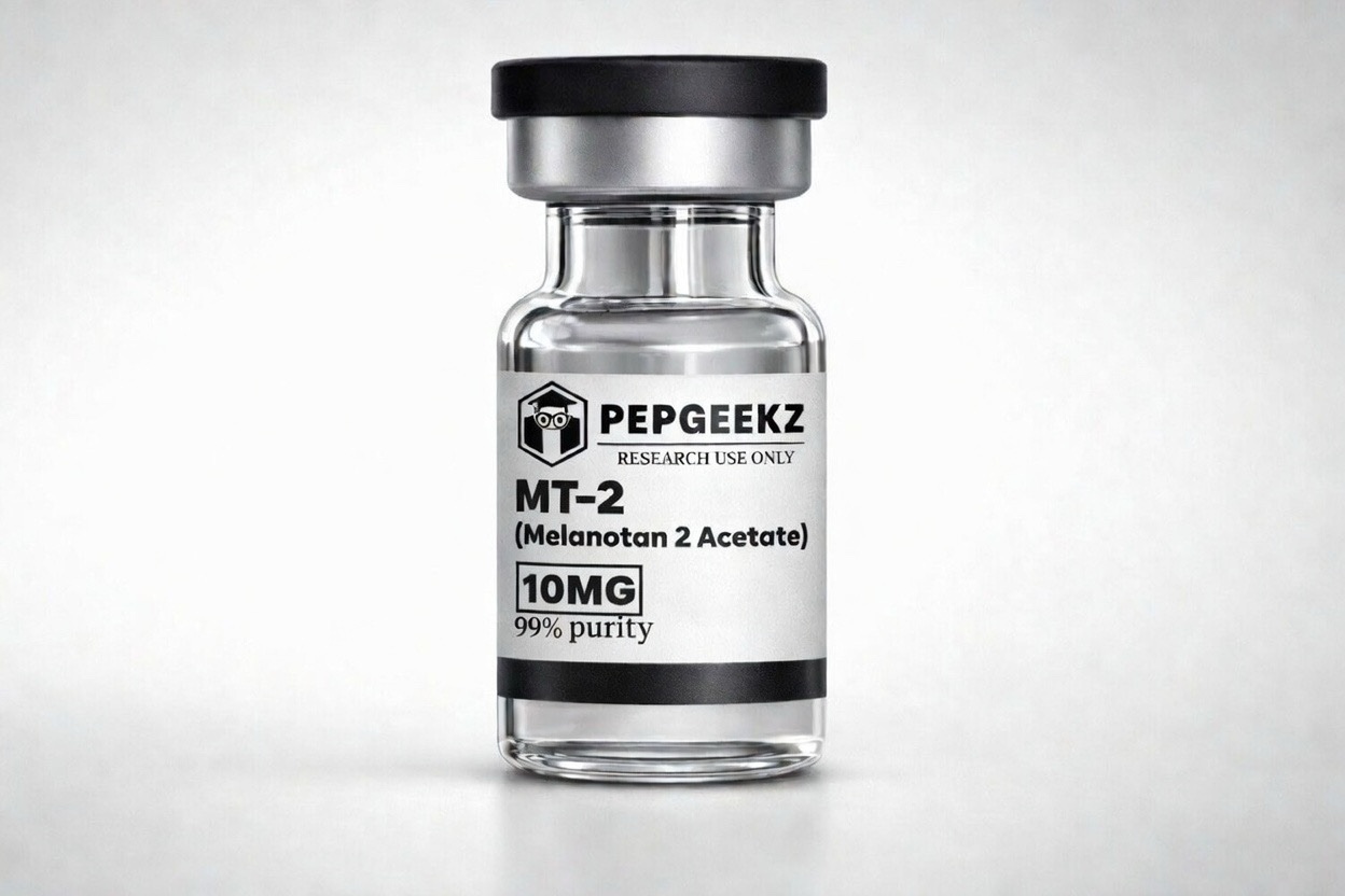 MT-2 (Melanotan II Acetate) is a synthetic melanocortin peptide commonly studied in controlled laboratory environments for its interaction with melanocortin receptor pathways. Researchers investigate this compound for its role in pigmentation signaling, receptor-binding mechanisms, and peptide–receptor interaction within melanocortin systems.